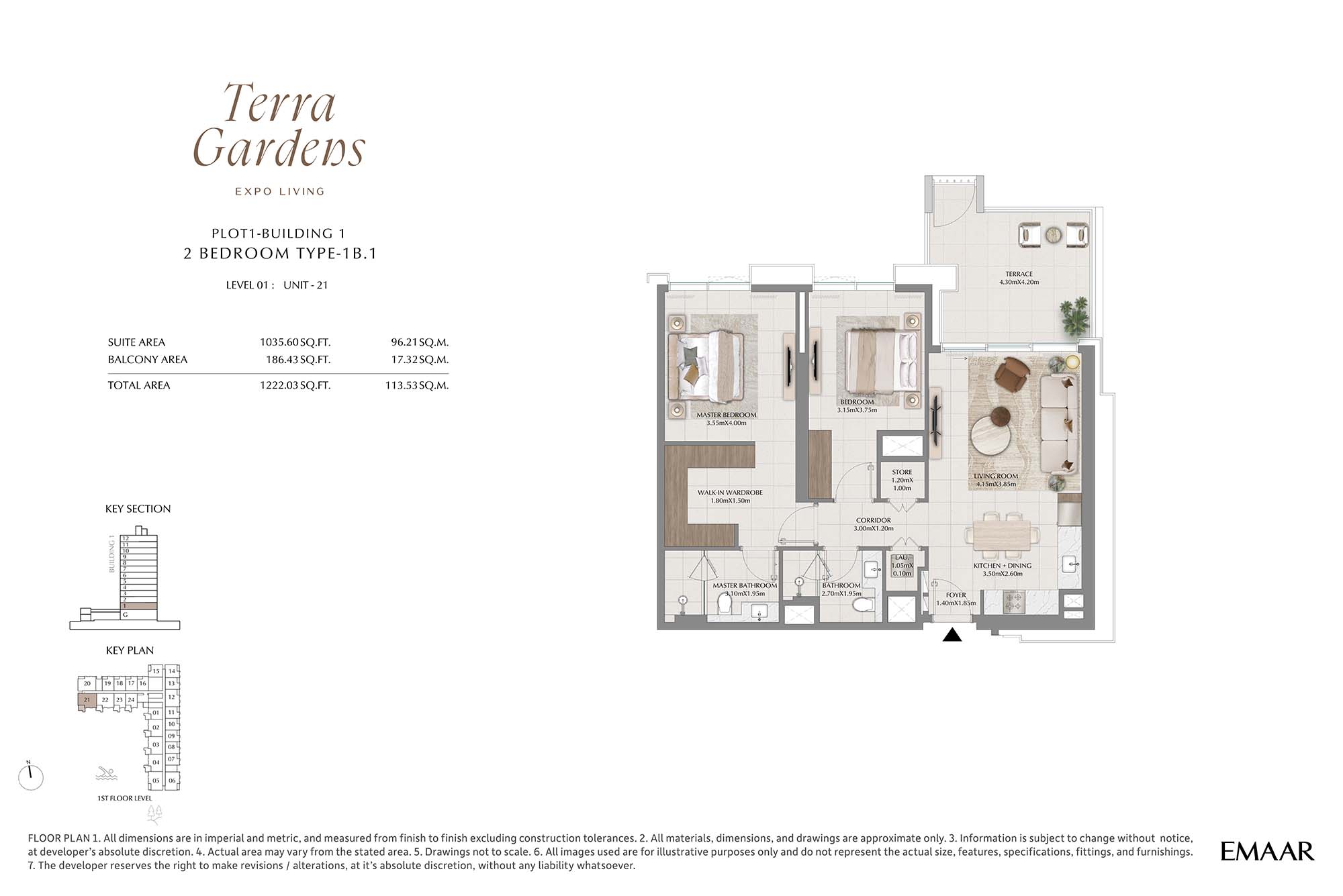 | Buildings 1 | 2 Bedrooms | 1st Level Unit-21 (Type-1B.1) | 1222.03 Sq Ft | Apartments |