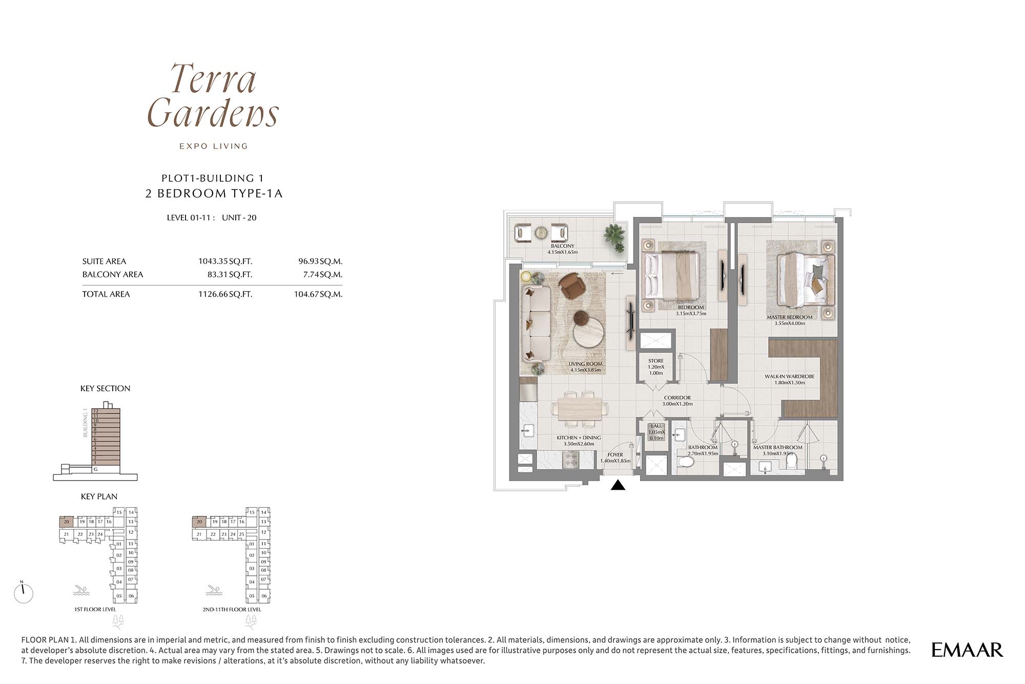 | Buildings 1 | 2 Bedrooms | 1st-11th Level Unit-20 (Type-1A) | 1126.66 Sq Ft | Apartments |