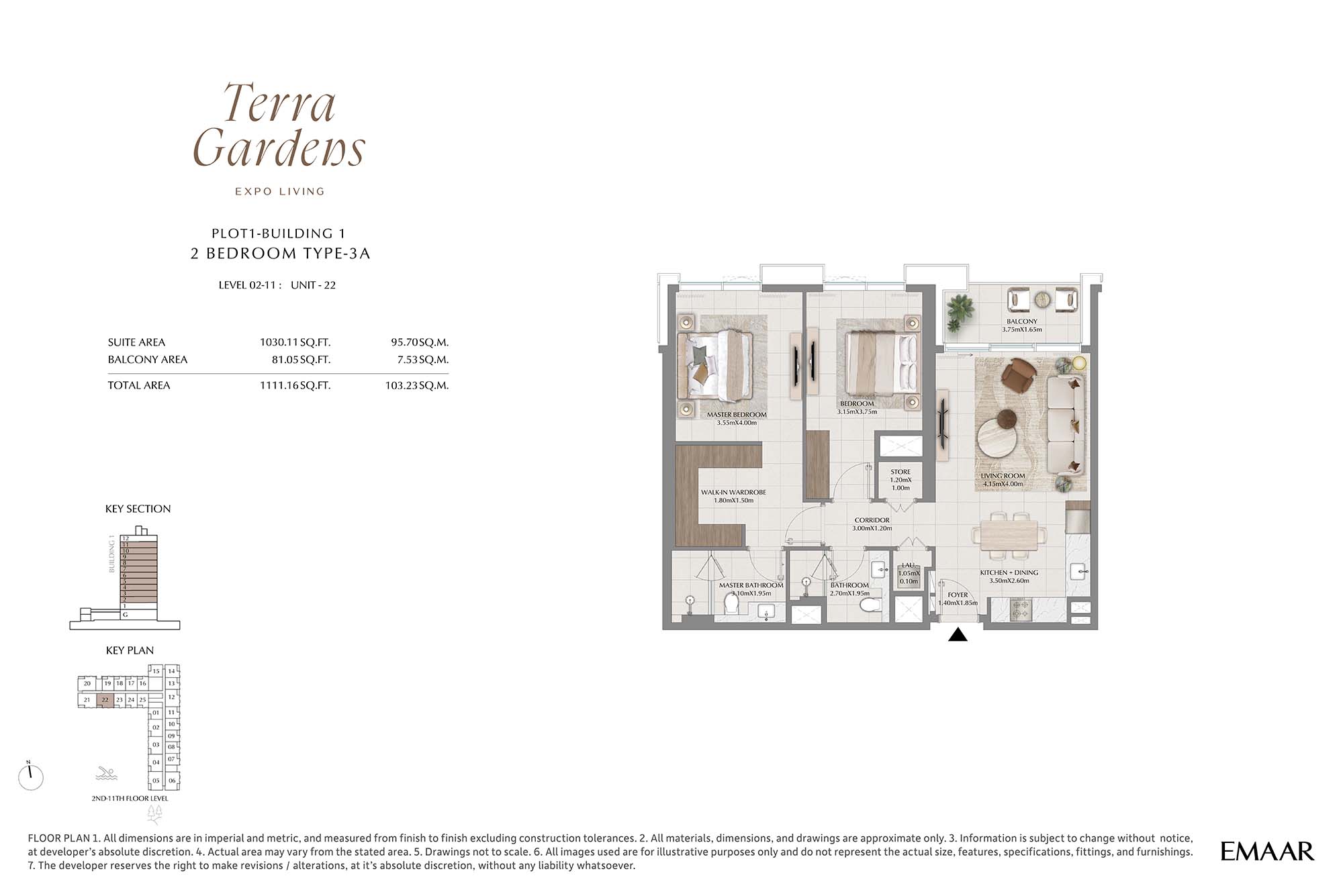 | Buildings 1 | 2 Bedrooms | 2nd-11th Level Unit-22 (Type-3A) | 1111.16 Sq Ft | Apartments |