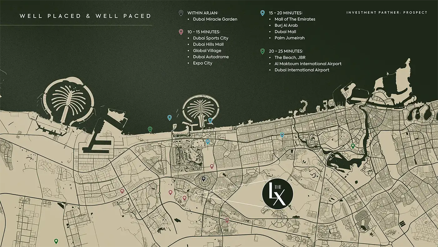 The Lx is located at Arjan, one of the fast-growing areas in Dubai that connects smoothly to all the major areas. With the help of major road networks including Sheikh Mohammed Bin Zayed Road and Umm Suqeim Road offers the community an excellent connectivity. Residents living here are just minutes away from iconic attractions such as Dubai Miracle Garden and Butterfly Garden, as well as Dubai Hills Mall, schools, healthcare facilities, and business hubs. It also offers a growing mix of restaurants, retail outlets, and entertainment options, which is quickly emerging as a prime location for residents and investors. It is seeking a well-rounded, vibrant lifestyle in Dubai.