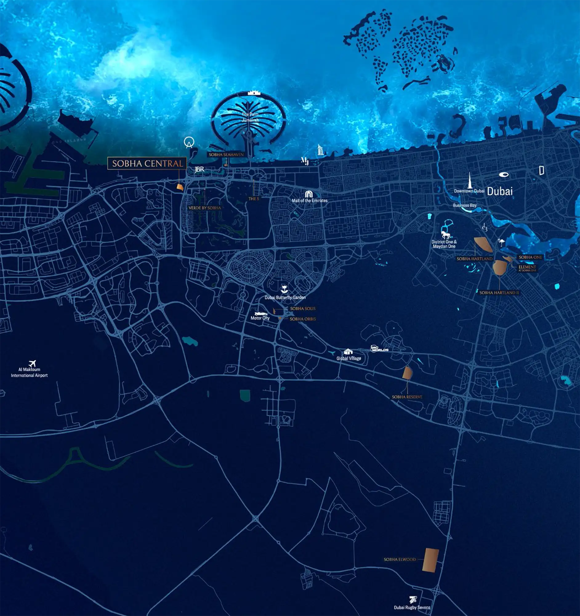 The Mirage is a part of world class community named as Sobha Central that is positioned at the major highway of Dubai Sheikh Zayed Road. The development is near to Jebel Ali Village and residents can easily walk to Jebel Ali Metro Station and Jumeirah Lake Towers Community. Residents can also reach to commercial port of Jabal Ali, Dubai Marina’s Beach, Marina Walk, and Marina Mall within five minutes. Reaching to famous locations of Dubai such as Burj Al Arab, Business Bay, and Burj Khalifa is also convenient, while frequent travelers can get benefitted by accessibility to the two international airports of the city.