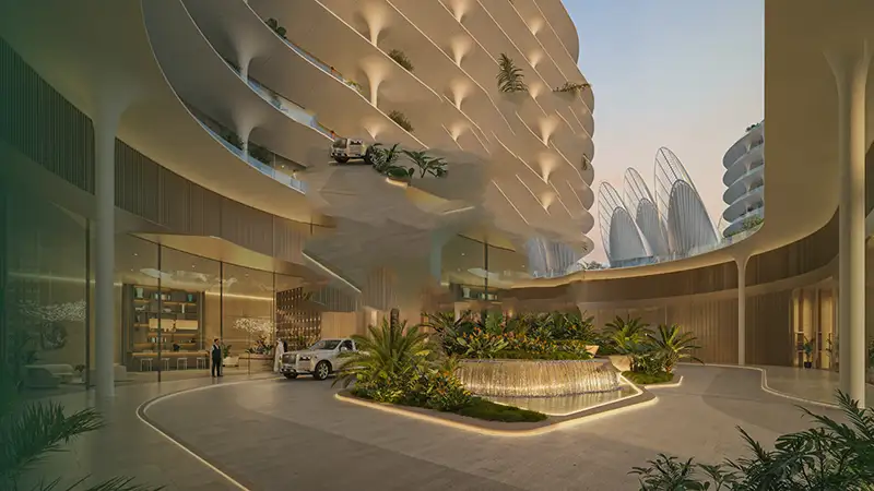 - Curved-L shaped structures, sleek facades and regal golden hues make them look stunning in a gently sloping waterfront.
