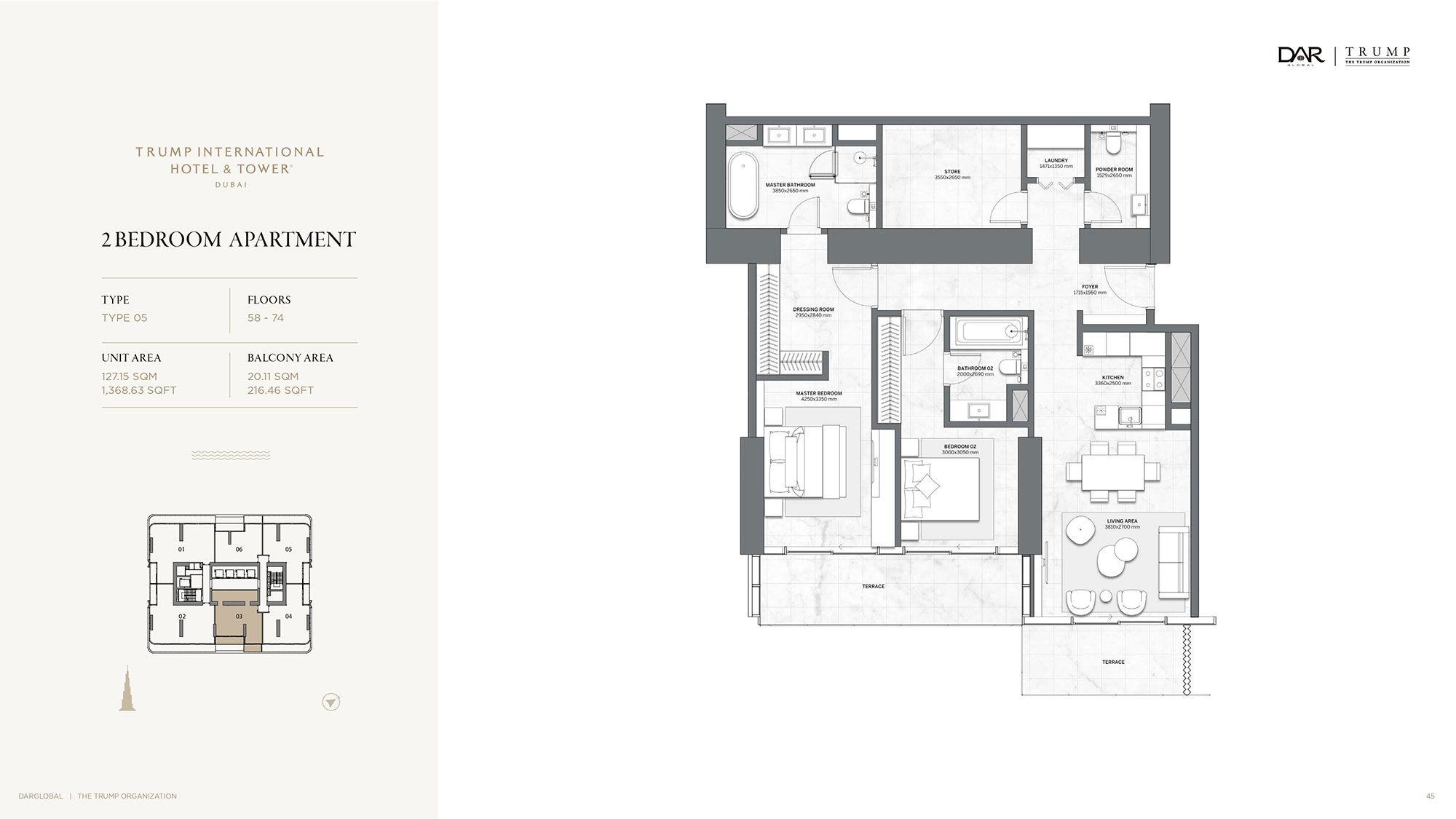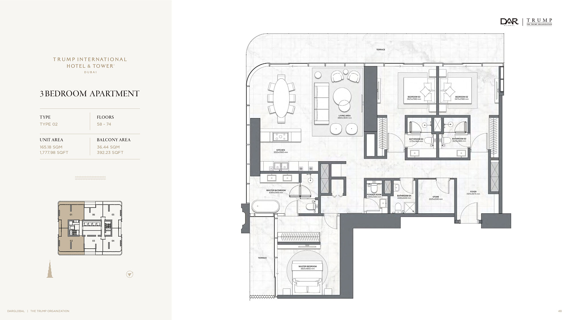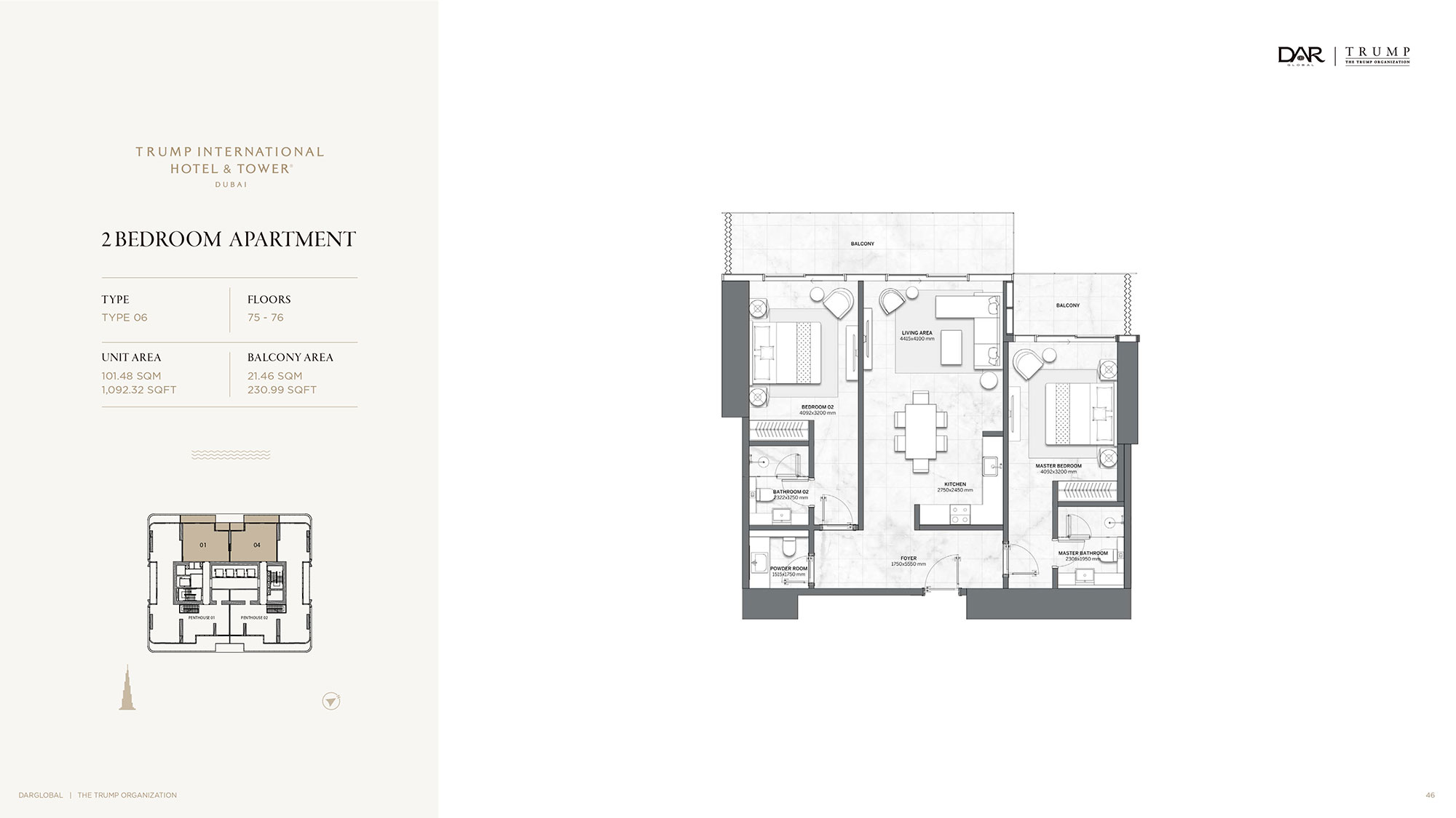 Trump Tower at Trade Centre First, Dubai features a private residential floor plan layout with 2, 3 and 4-bedroom apartments and penthouses. Open concept layouts are complemented with oversized floor to ceiling windows that are flooded with an abundance of natural light, giving the residences an airy feeling of extravagance. Designer premium finishes, sleek modern cabinetry and each bedroom completed with en-suite bathrooms and built-in wardrobes making it amazing and convenient living.