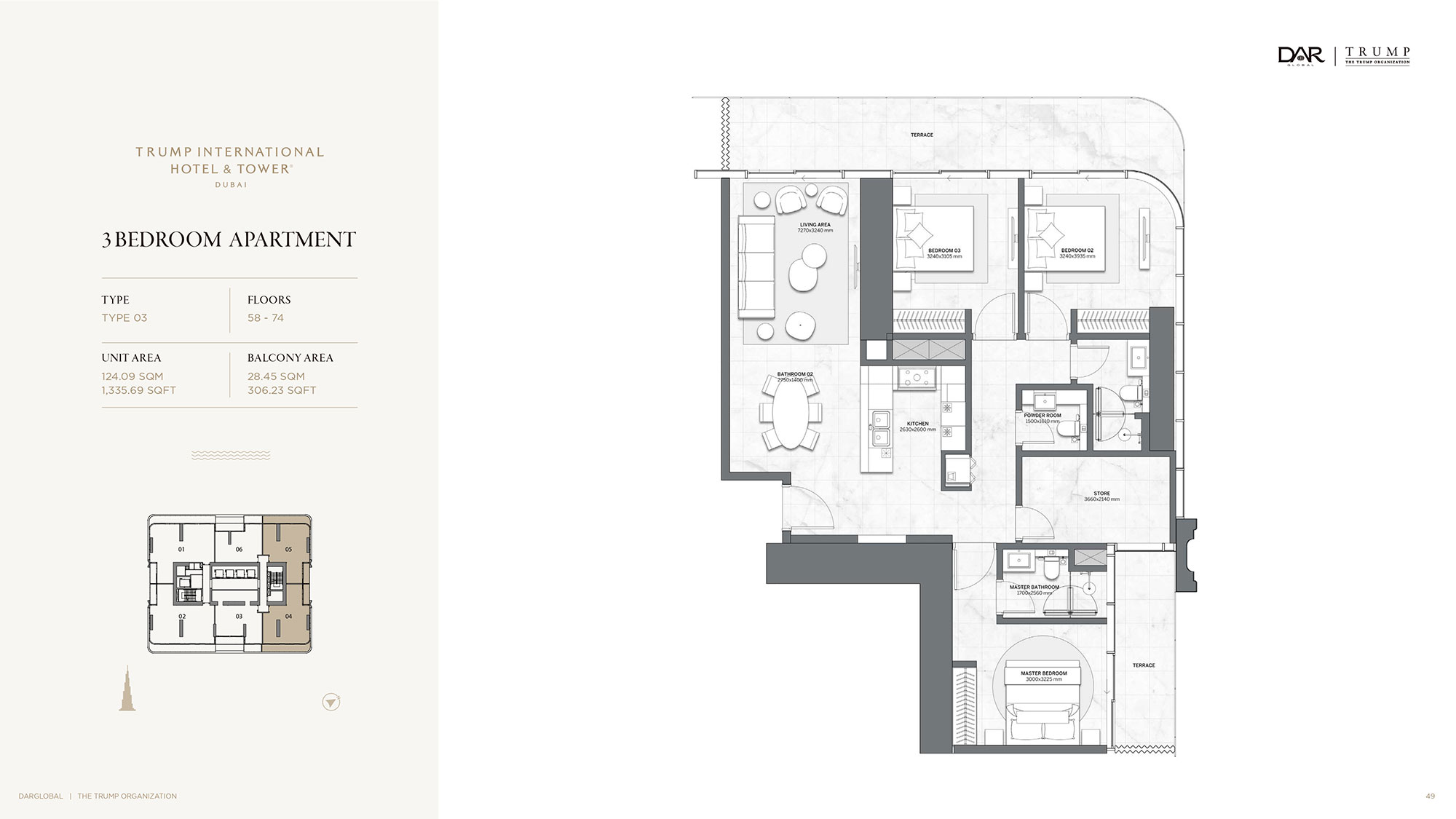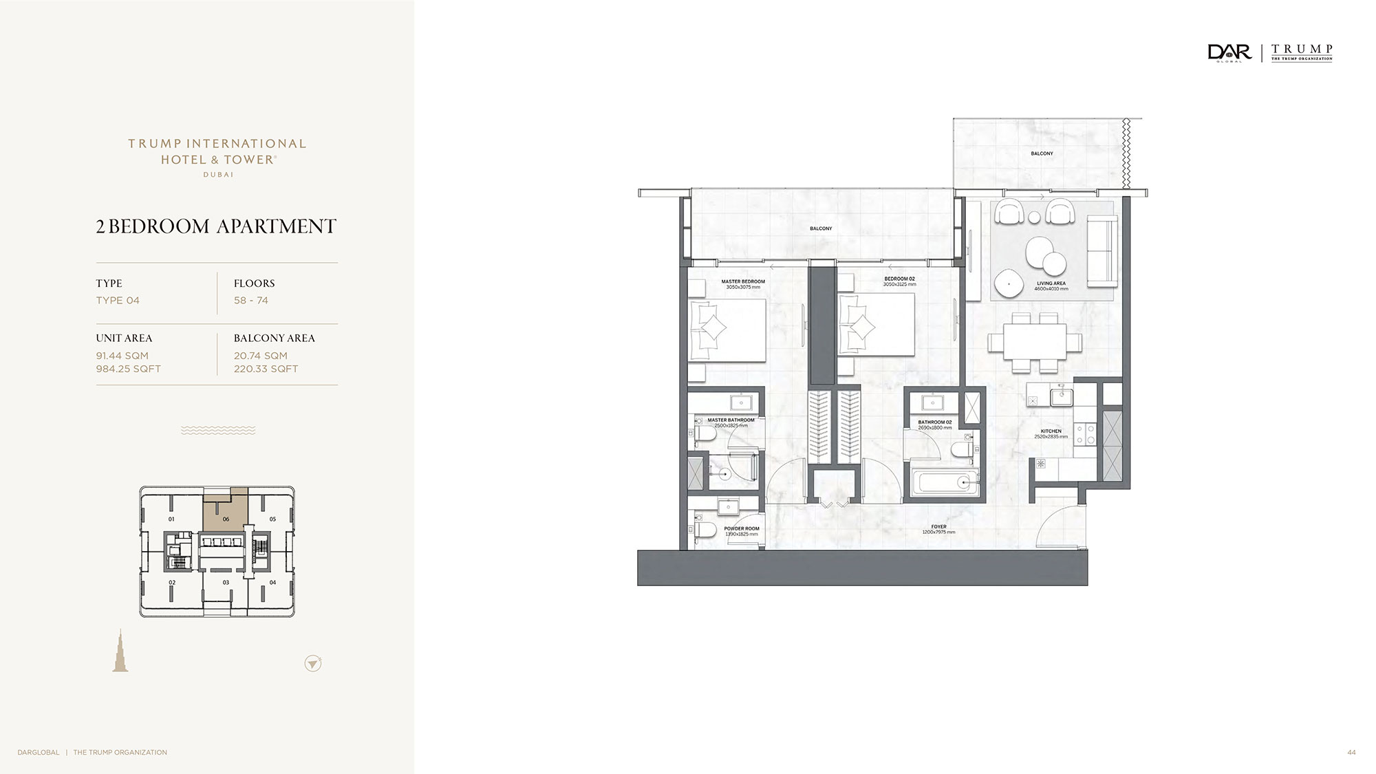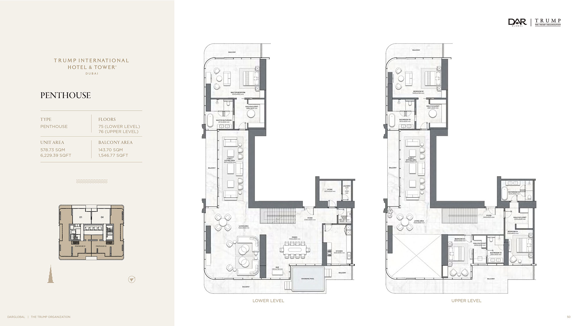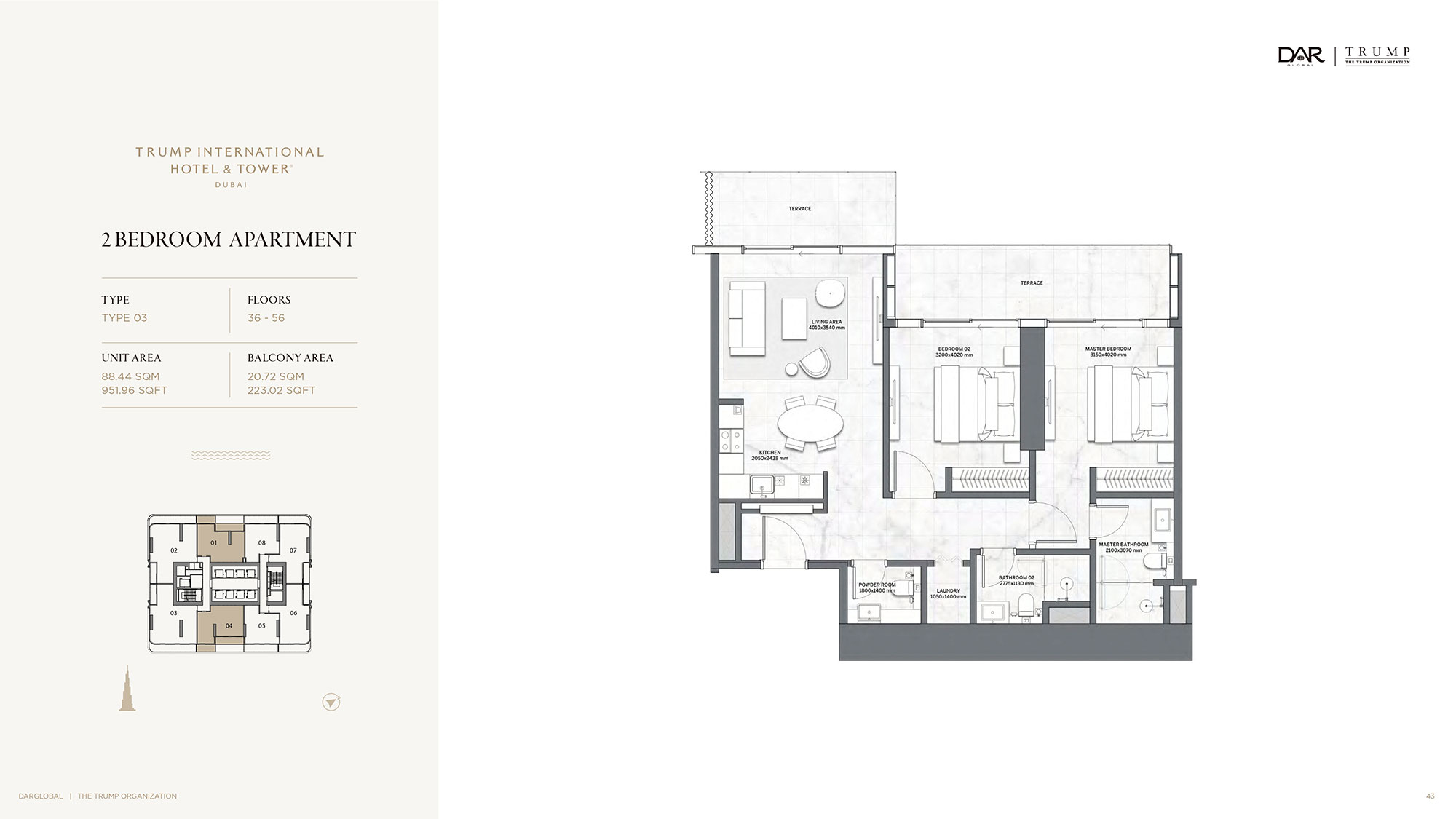 Trump Tower at Trade Centre First, Dubai features a private residential floor plan layout with 2, 3 and 4-bedroom apartments and penthouses. Open concept layouts are complemented with oversized floor to ceiling windows that are flooded with an abundance of natural light, giving the residences an airy feeling of extravagance. Designer premium finishes, sleek modern cabinetry and each bedroom completed with en-suite bathrooms and built-in wardrobes making it amazing and convenient living.