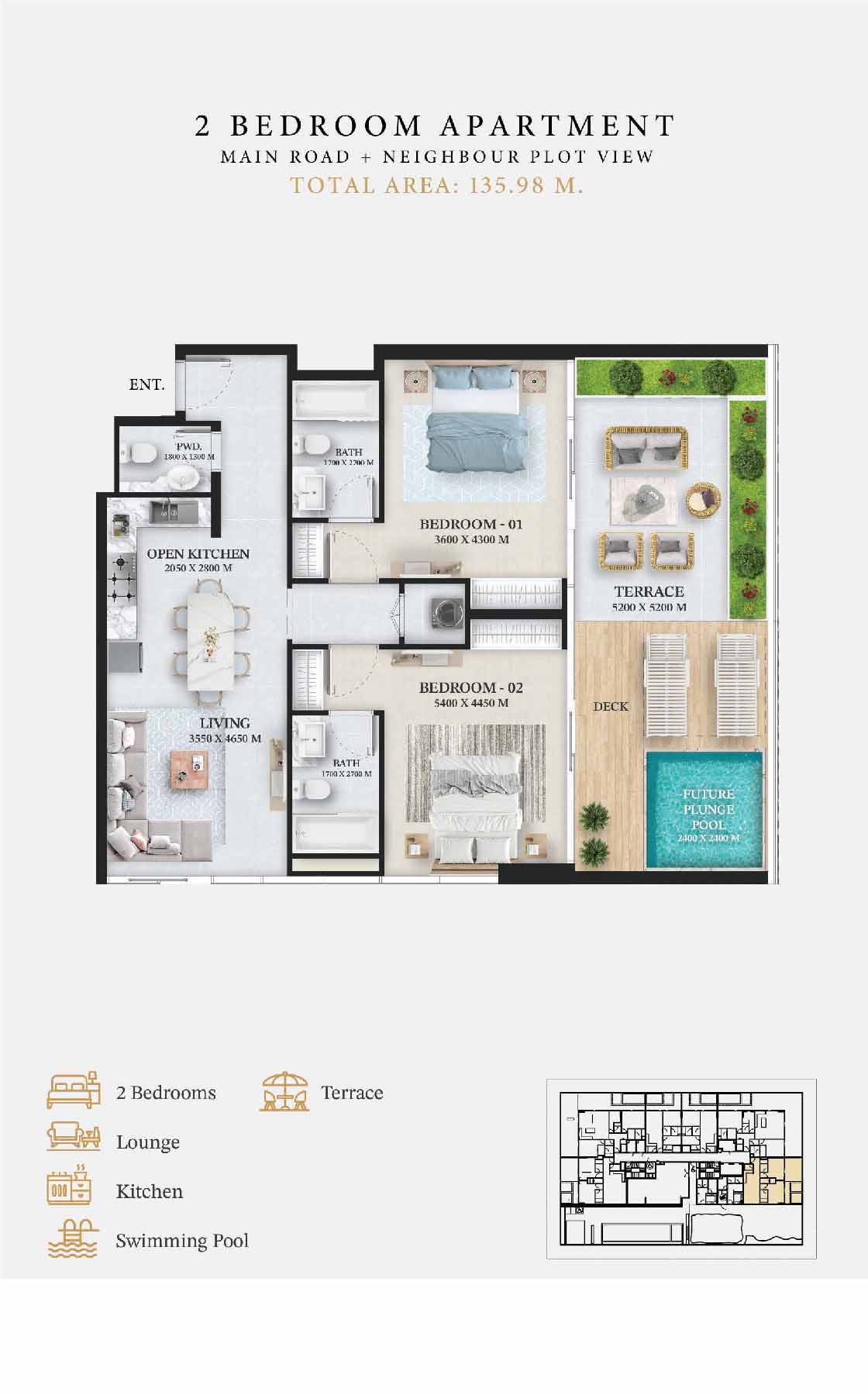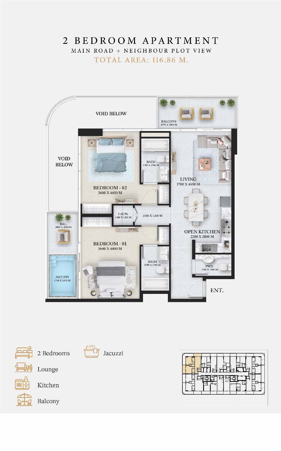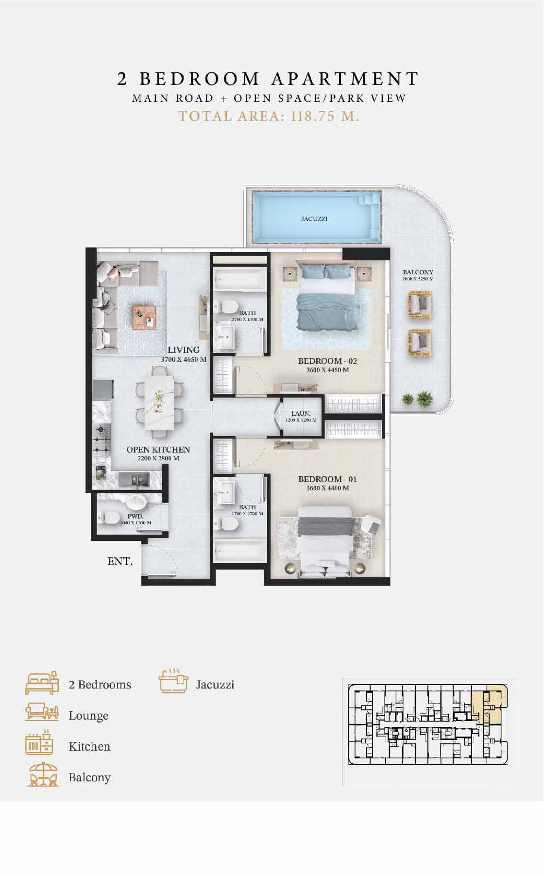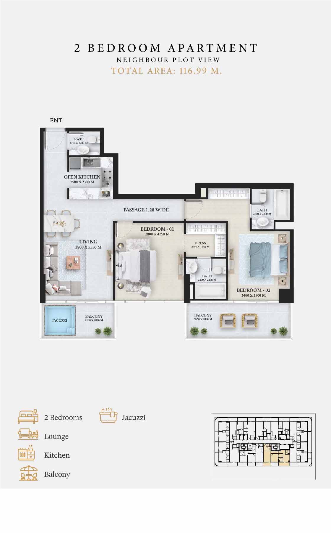 Wellington Ocean by ANK Developers is offering uniquely designed floor plans in 1 and 2-bedroom apartments and 3-bedroom duplexes. It comes with spacious design with well-planned interiors and having scenic views of island and ocean. Each unit is having floor to ceiling glass windows to offer ample natural light and ventilation and it has modern kitchens equipped with automatic appliances, smart home features and built with best quality materials. The builder has planned to offer marvelous apartment with grand aesthetics which ensure to enhance the overall living experience.