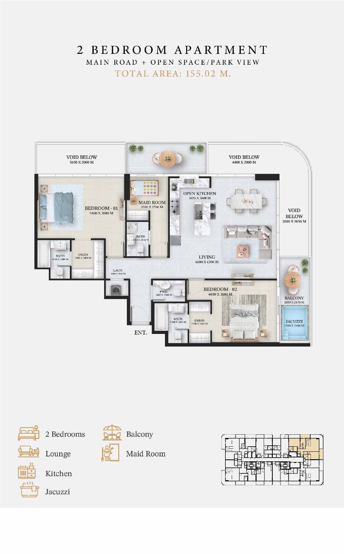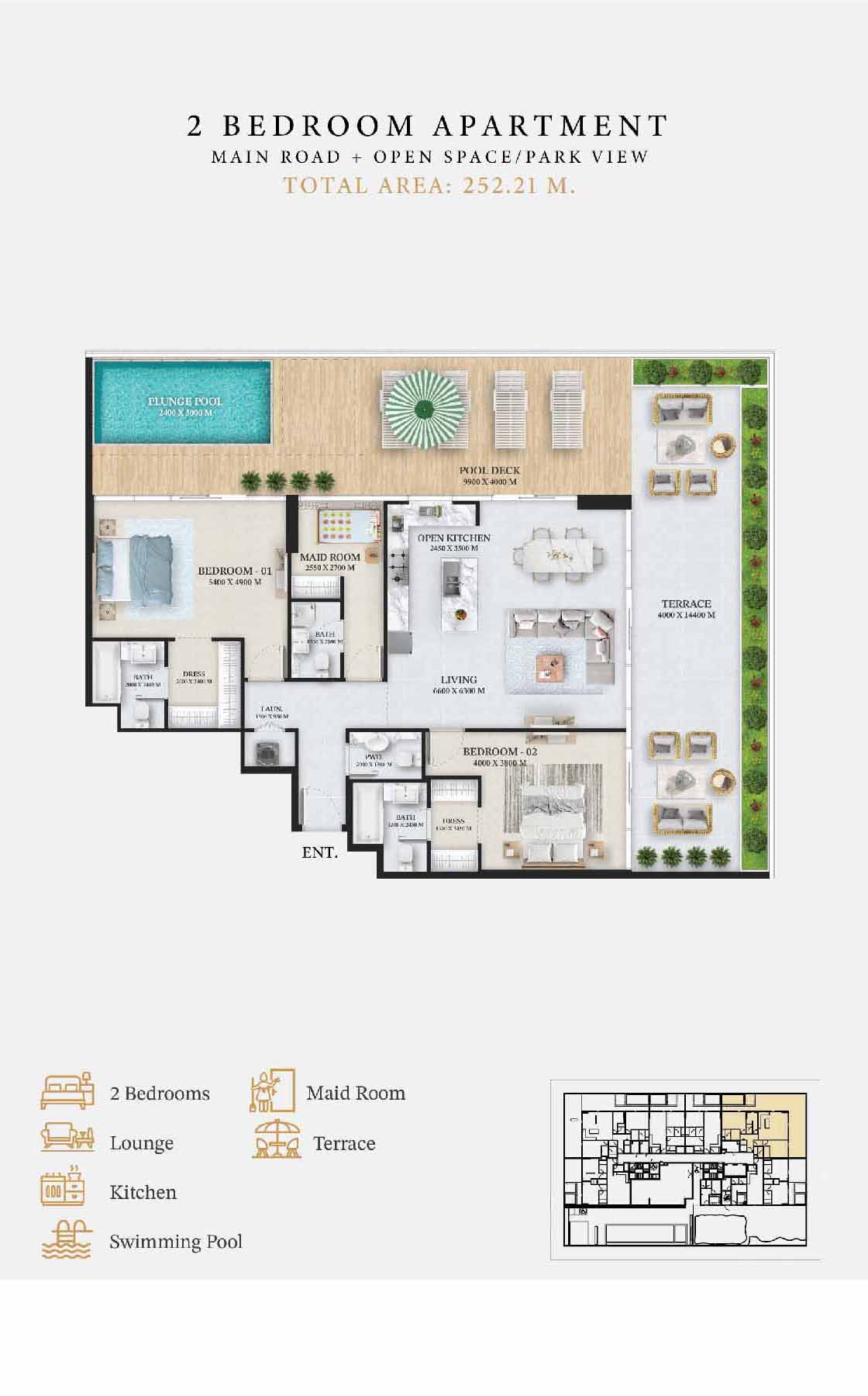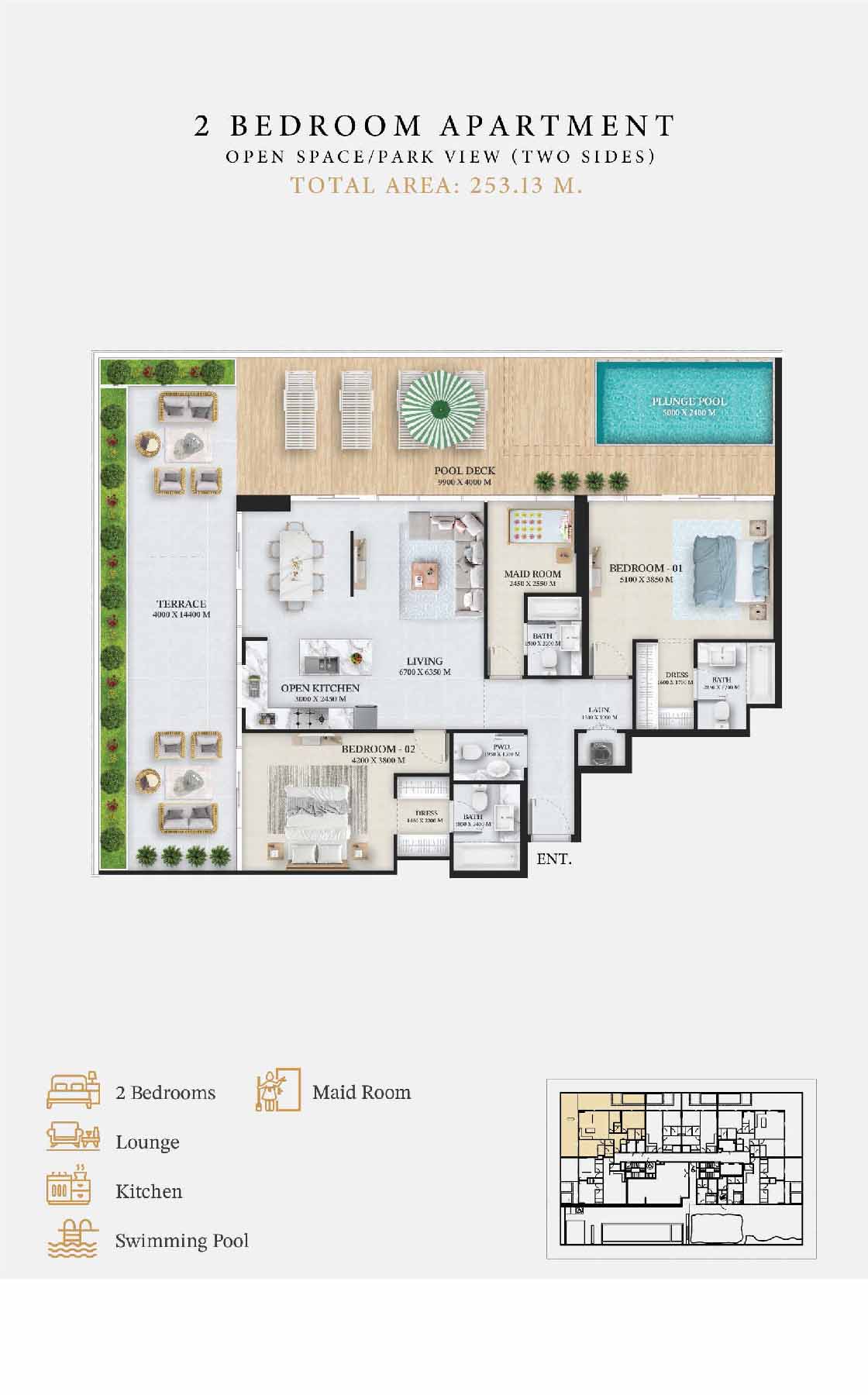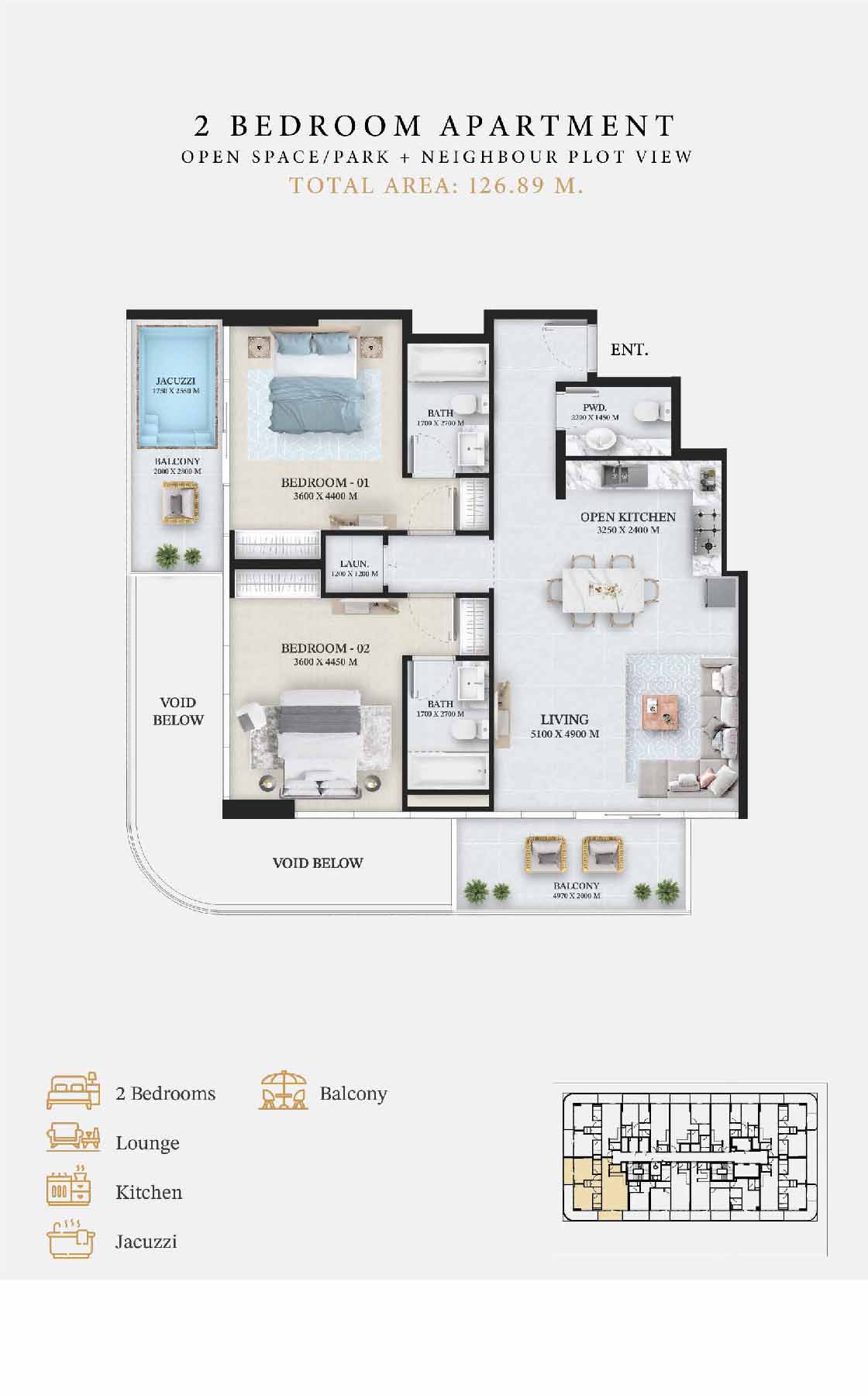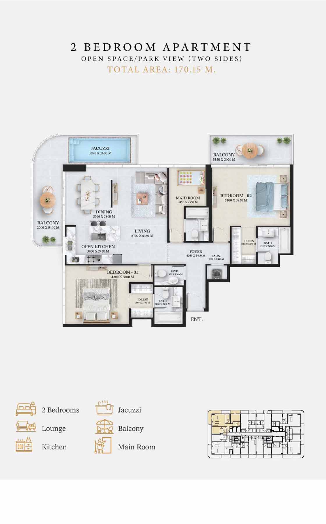 Wellington Ocean by ANK Developers is offering uniquely designed floor plans in 1 and 2-bedroom apartments and 3-bedroom duplexes. It comes with spacious design with well-planned interiors and having scenic views of island and ocean. Each unit is having floor to ceiling glass windows to offer ample natural light and ventilation and it has modern kitchens equipped with automatic appliances, smart home features and built with best quality materials. The builder has planned to offer marvelous apartment with grand aesthetics which ensure to enhance the overall living experience.
