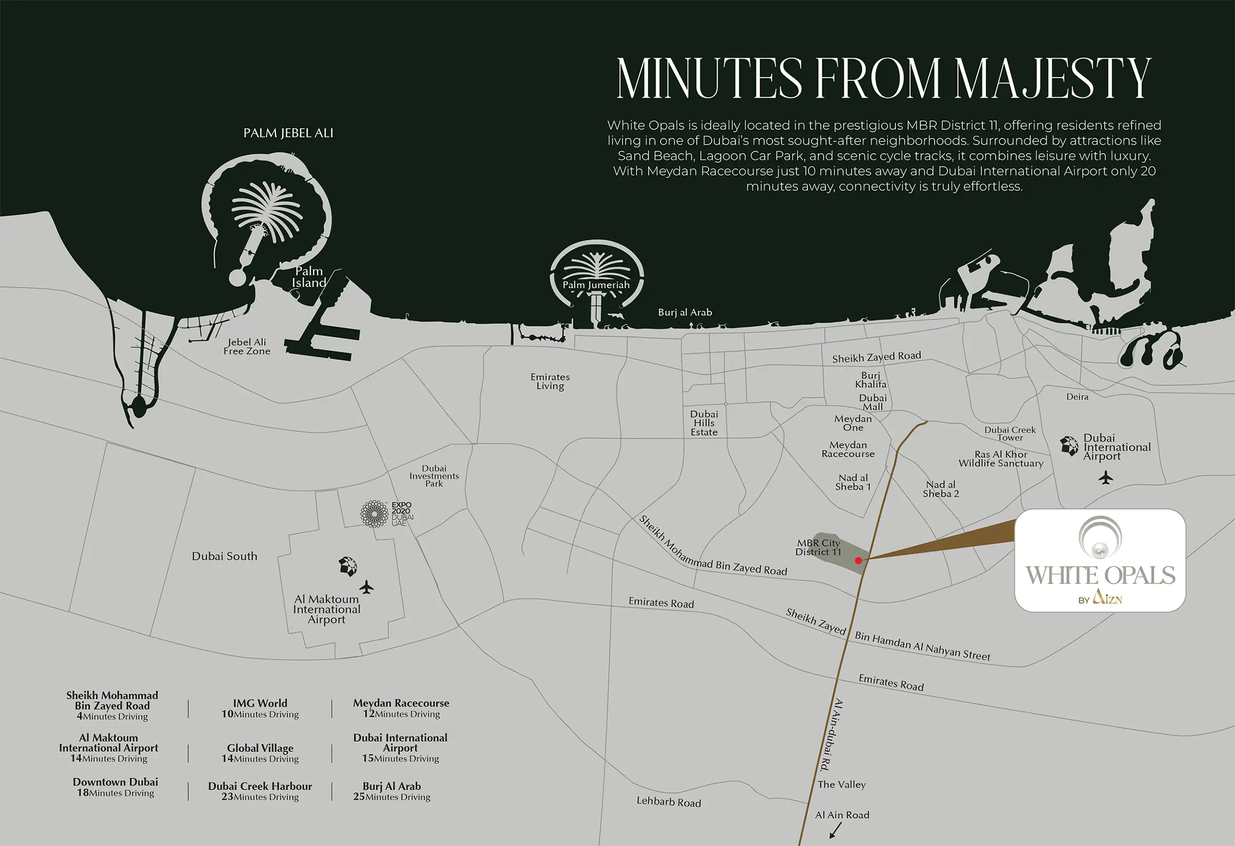 White Opals is located within the Mohammed Bin Rashid City (MBR City), that is a prominent mixed-use development having residential, commercial, and leisure facilities. Residents of this development shall enjoy the exceptional connectivity through Al Khail Road and Sheikh Mohammed Bin Zayed Road and reach to key areas of Dubai such as Downtown Dubai, Business Bay, Meydan Racecourse and DIFC. The area is developed by combining luxurious housing with an urban lifestyle and peaceful atmosphere that offers unparalleled convenience to residents. With access to a wide range of facilities such as schools, hospitals, world-class dining, shopping, and recreational options, residents will enjoy a premium lifestyle.